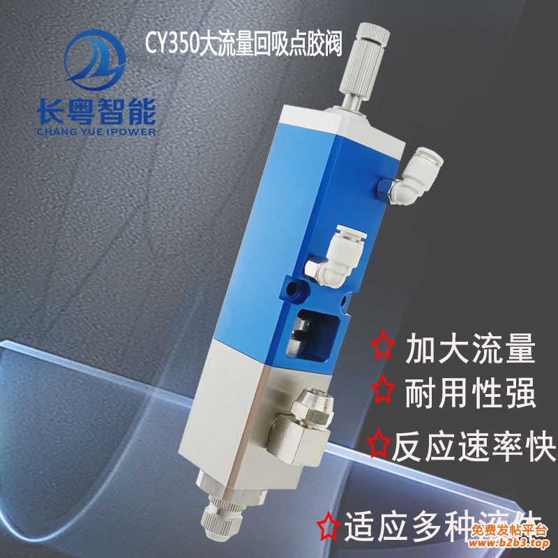 CY350 大流量回吸阀适用涂胶稳定胶量偏多的现场作业,具有润滑性的一般粘接剂、UV用粘接剂、硅胶、环氧树脂、黄胶,锡膏类等浓度高,流动性小,流量大的胶水使用。有调节螺母可调节流量大小,专用锁止螺母锁止调节机构,确保调整后稳定输出,便于调整涂胶量,回吸大,防止吐胶后拉丝。